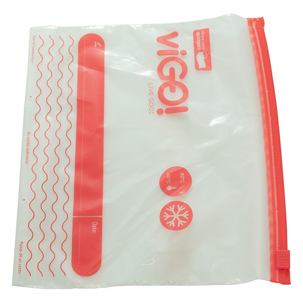 Wielorazowe woreczki viGO! z praktycznym suwakiem to funkcjonalne rozwiązanie do codziennego przechowywania, pakowania i mrożenia żywności. Dzięki szczelnemu zamknięciu z suwakiem woreczki chronią zawartość przed wilgocią i utratą świeżości. Możliwość usunięcia powietrza pozwala na dłuższe przechowywanie produktów bez utraty wartości odżywczych. Woreczki są odporne na niskie temperatury, nadają się do mycia w zmywarce i mogą być używane wielokrotnie. Zapakowane w poręczny kartonik, który ułatwia przechowywanie. Sprawdzą się również poza kuchnią – idealne do przechowywania drobnych przedmiotów, takich jak biżuteria, śrubki czy paragony.